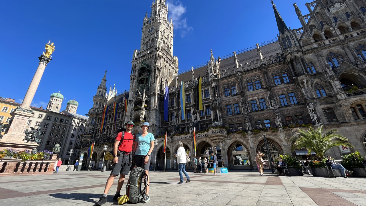 Als wir das Hotel verlassen wollten, tauchte zufällig noch jemand zum aus-checken auf. Nach einer kurzen Diskussion ging es endlich los. Mit sehr viel Verspätung liefen wir am Marienplatz los. Wegweiser suchten wir vergebens. Buch und die Komoot App wollten auch verschiedene Wege gehen, dadurch war der Start an diesem Tag etwas holprig.