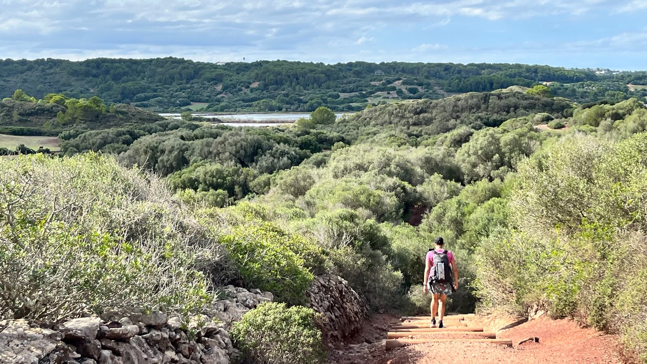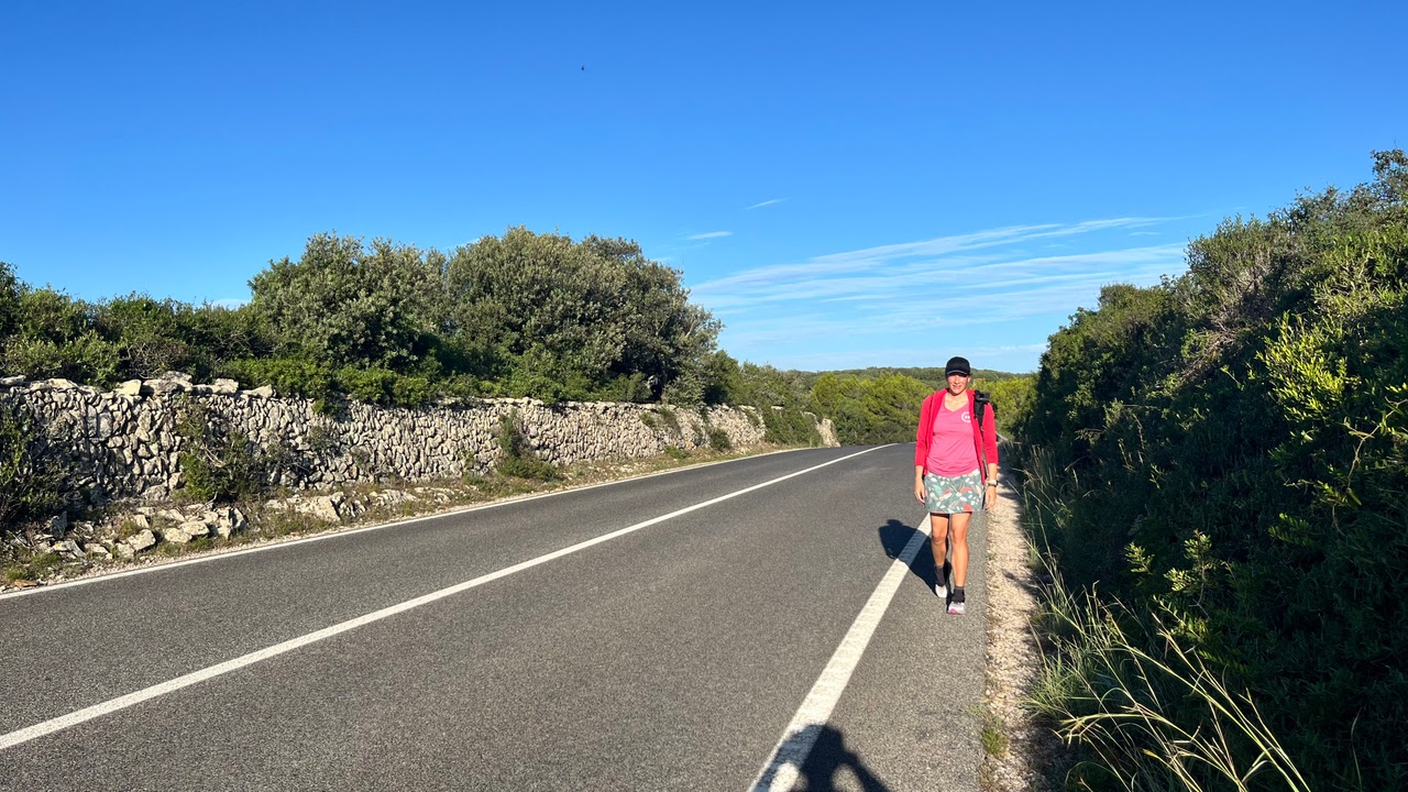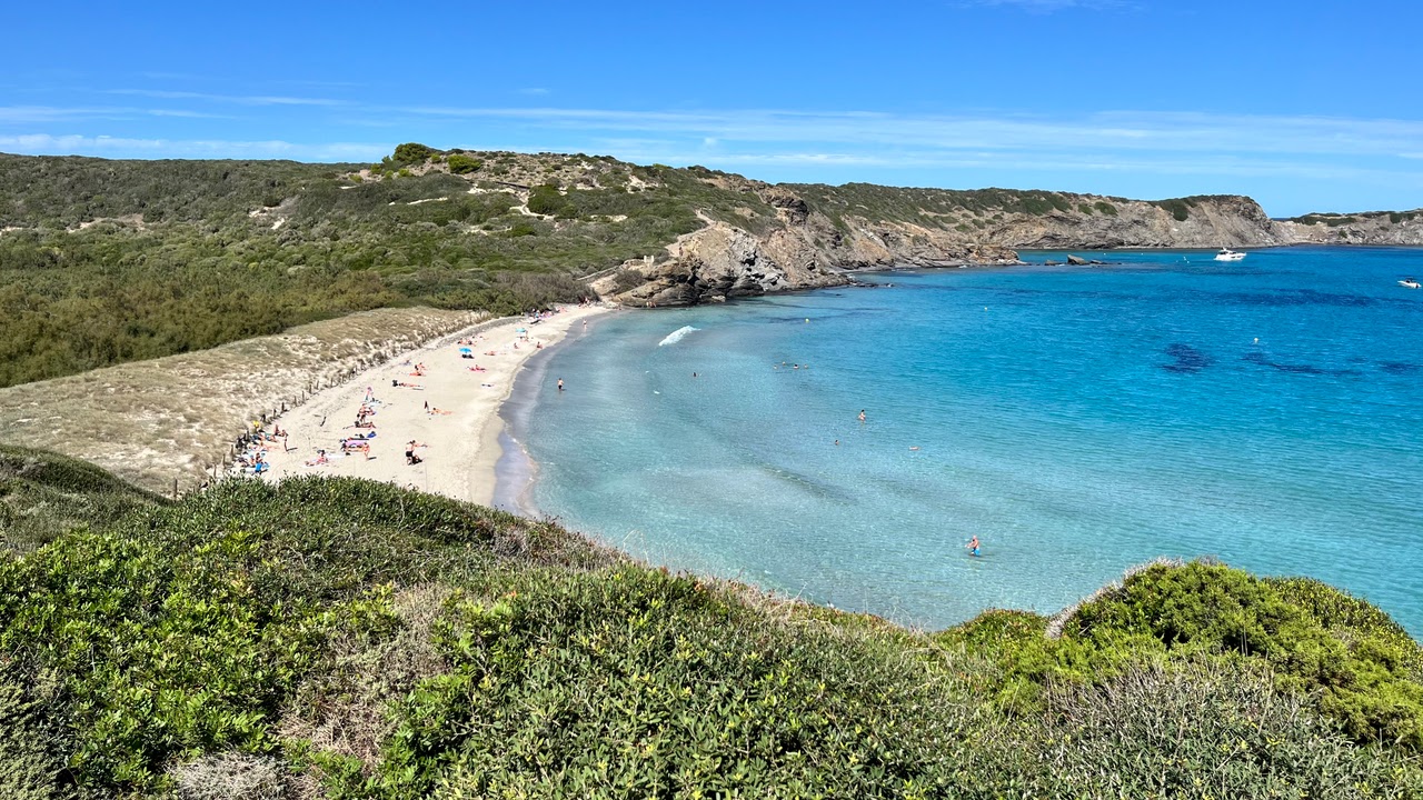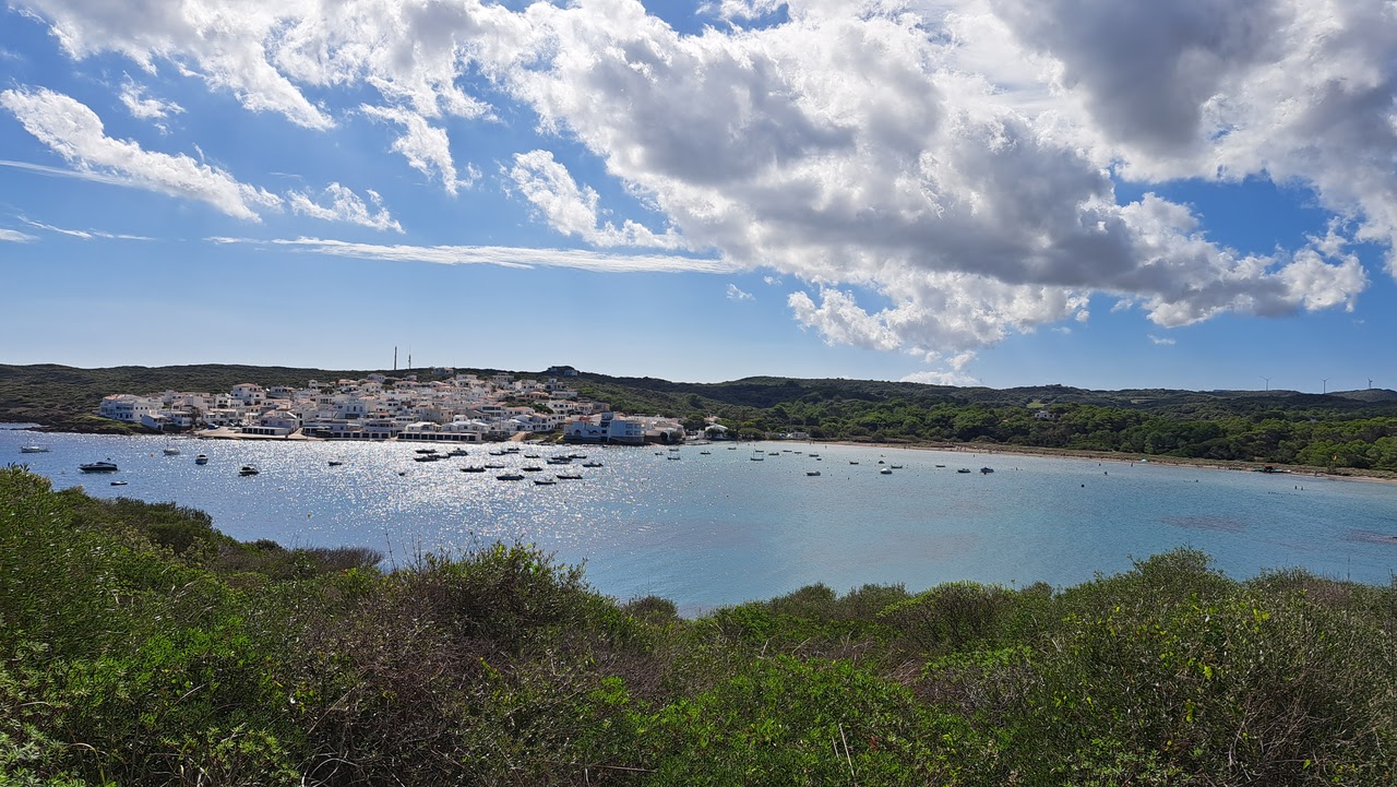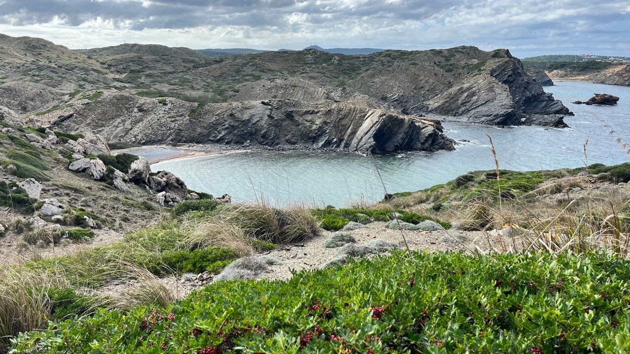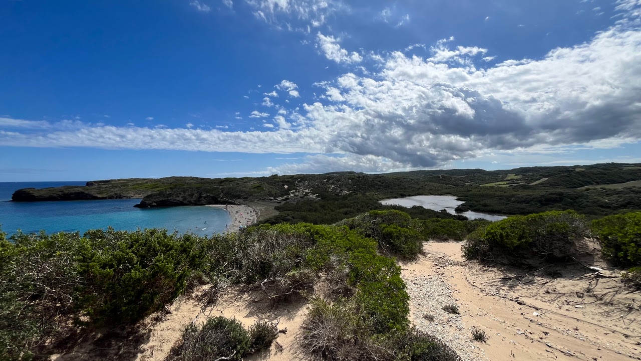 Wir liefen durch die Gassen mit dem südländischen Flair in Richtung Hafen. Als wir dort ankamen, hatten wir den Ausblick in Richtung Yachthafen. Dieser war voll mit Booten und sehr von Industrie geprägt. Wir liefen weiter und kurz vor dem Ende der Bucht hatten wir einen herrlichen Rückblick auf die Stadt und das Franziskanerkloster, welches über der Stadt thront. Nach einer Brücke begann der Weg entlang der Straße nach Sa Mesquita. Kein besonders schöner Weg, aber hier und da hatten wir ein paar mal schöne Aussichten zurück nach Maó. Plötzlich hörten wir eine Stimme aus den Büschen neben der Straße und wir trafen auf Francesca, die auch dem auf dem Camí unterwegs war. Google hatte ihr eine schönere alternative Route vorgeschlagen aber diese führte mitten durch Büsche und ihre Beine waren dadurch schon komplett verkratzt. Marcel kam ihr zur Hilfe und zeigte ihr den Weg raus. In der Feriensiedlung Sa Mesquita, an der Nordküste angekommen, suchten wir nach einem Supermarkt, aber dort war keiner zu finden. Sa Mesquita ist ein schöner ruhiger Ferienort mit ein paar Häuser und einem beliebten Strand. Ab dort gingen wir zusammen mit Francesca weiter und merkten, dass wir sogar das gleiche Ziel für den Abend hatten. Der weitere Küstenpfad eröffnete uns viele schöne Buchten und ein paar knackige Anstiege über die Dünen waren auch dabei. Die Ausblicke ließen uns immer wieder stauen. Wir machten einen Abstecher in das Örtchen Es Grau und deren Supermarkt. Wir kauften was leckeres zu Essen ein, um die Mittagspause auf später zu verschieben – natürlich für die perfekte Bucht mit anschließendem Bad im Meer.
