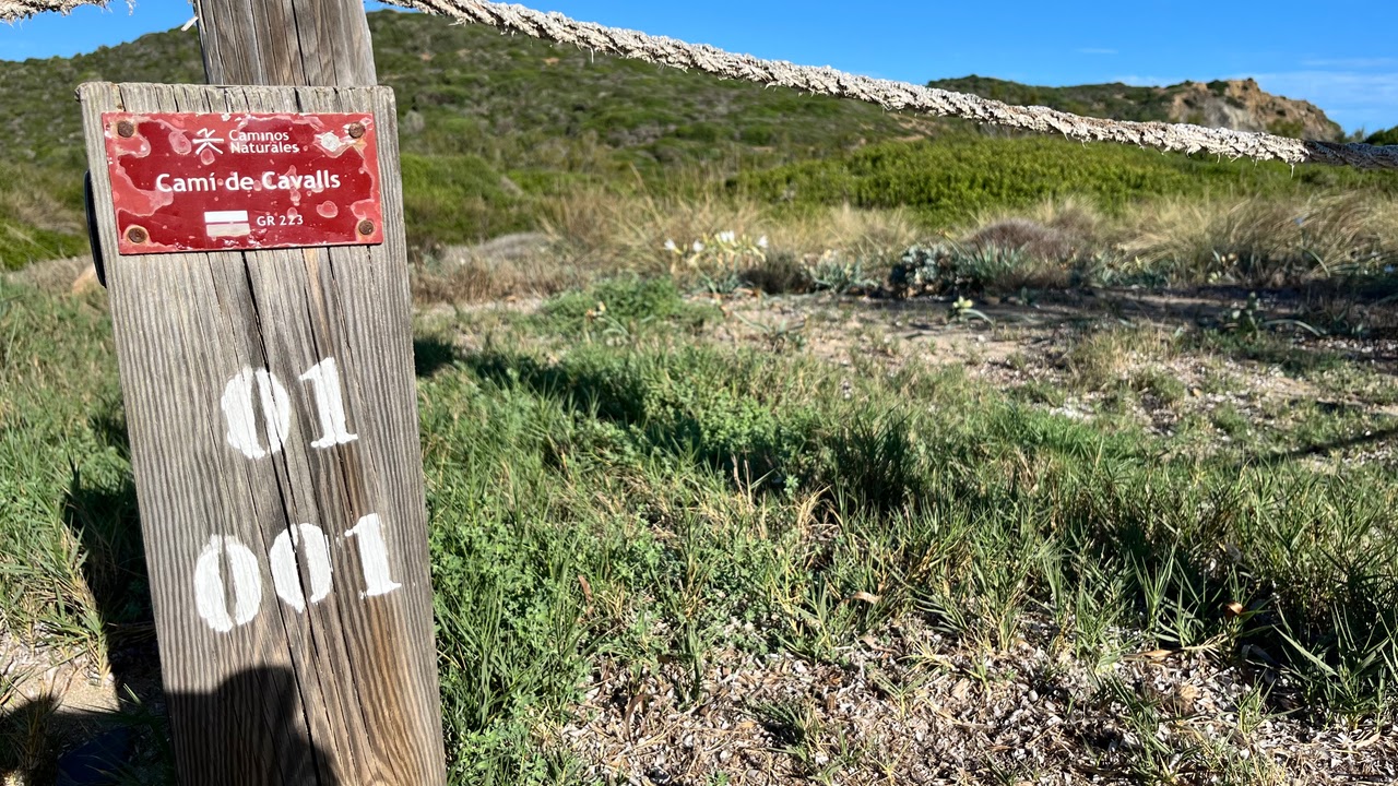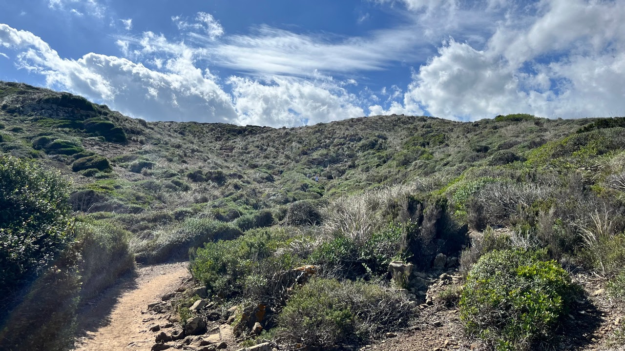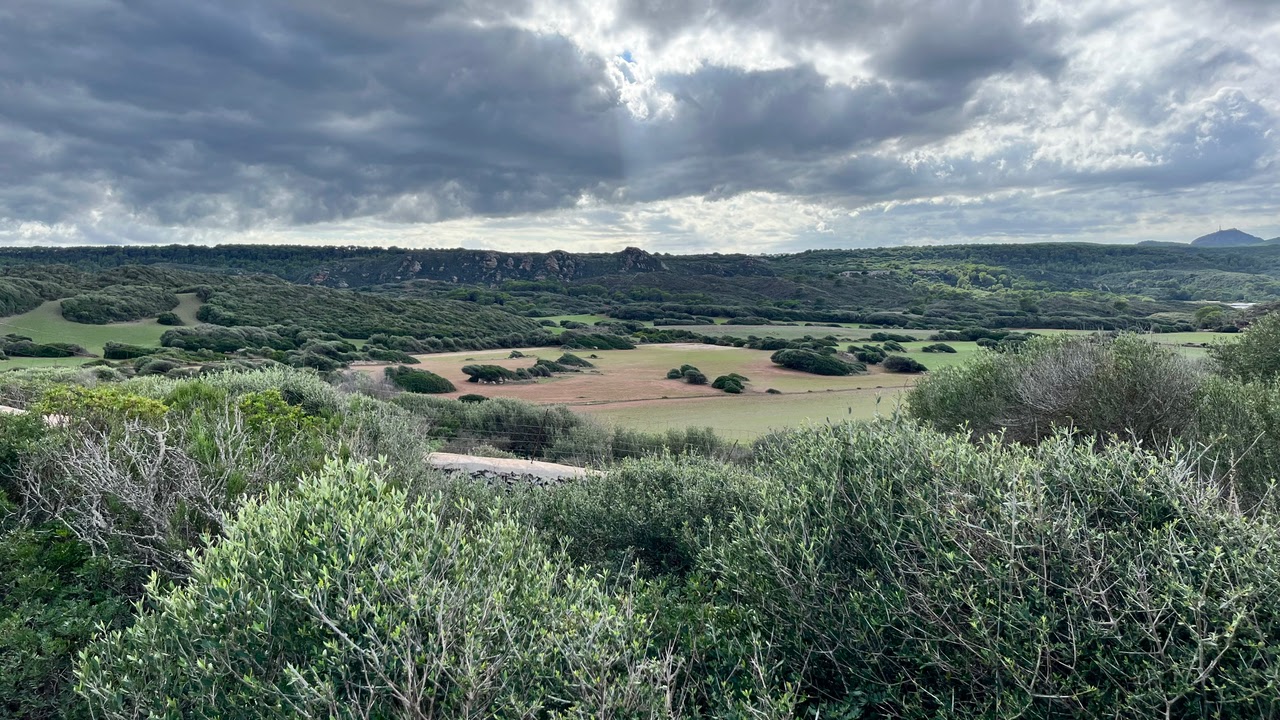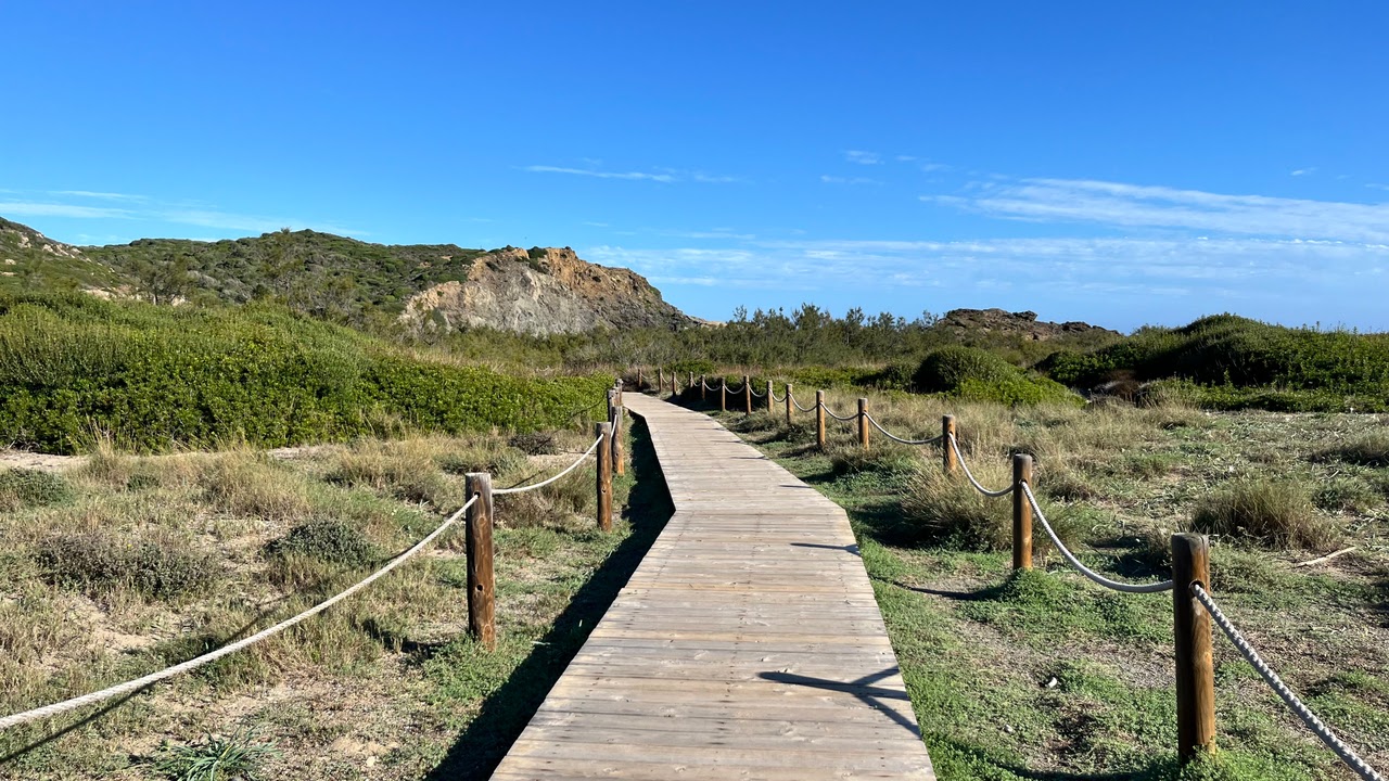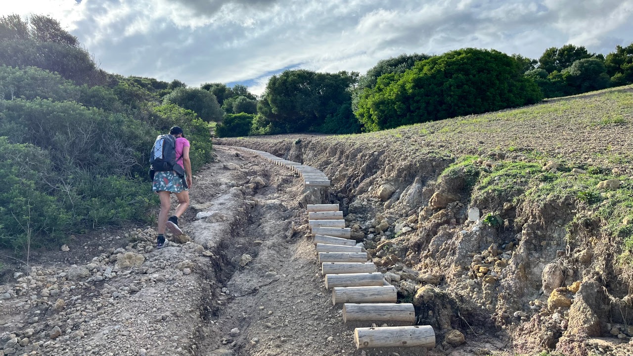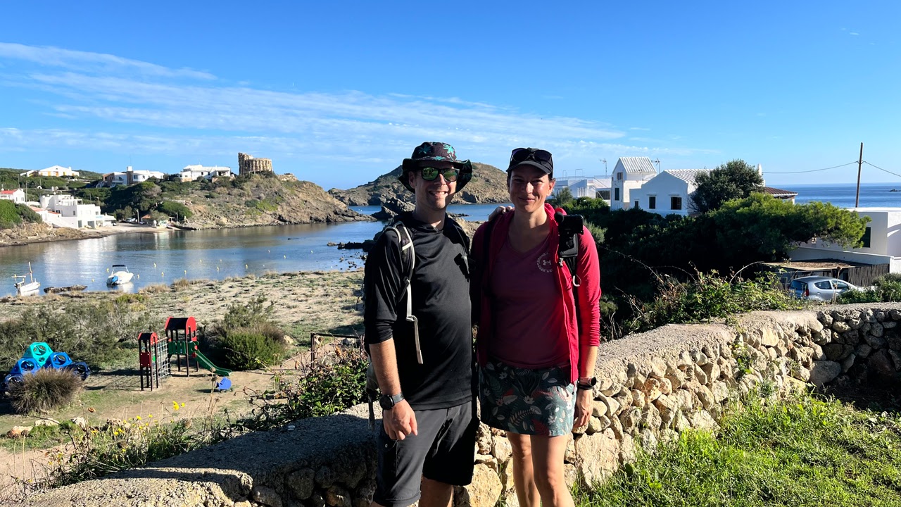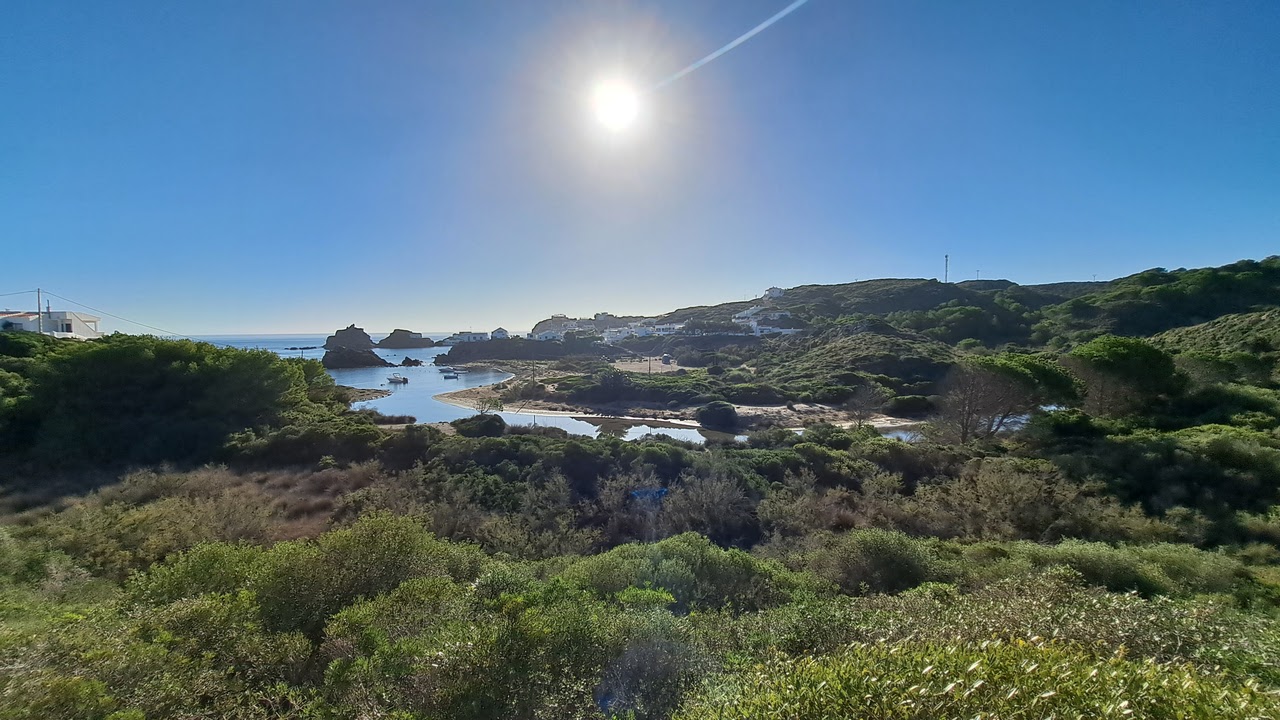 Wir liefen durch die Gassen mit dem südländischen Flair in Richtung Hafen. Als wir dort ankamen, hatten wir den Ausblick in Richtung Yachthafen. Dieser war voll mit Booten und sehr von Industrie geprägt. Wir liefen weiter und kurz vor dem Ende der Bucht hatten wir einen herrlichen Rückblick auf die Stadt und das Franziskanerkloster, welches über der Stadt thront. Nach einer Brücke begann der Weg entlang der Straße nach Sa Mesquita. Kein besonders schöner Weg, aber hier und da hatten wir ein paar mal schöne Aussichten zurück nach Maó. Plötzlich hörten wir eine Stimme aus den Büschen neben der Straße und wir trafen auf Francesca, die auch dem auf dem Camí unterwegs war. Google hatte ihr eine schönere alternative Route vorgeschlagen aber diese führte mitten durch Büsche und ihre Beine waren dadurch schon komplett verkratzt. Marcel kam ihr zur Hilfe und zeigte ihr den Weg raus. In der Feriensiedlung Sa Mesquita, an der Nordküste angekommen, suchten wir nach einem Supermarkt, aber dort war keiner zu finden. Sa Mesquita ist ein schöner ruhiger Ferienort mit ein paar Häuser und einem beliebten Strand. Ab dort gingen wir zusammen mit Francesca weiter und merkten, dass wir sogar das gleiche Ziel für den Abend hatten. Der weitere Küstenpfad eröffnete uns viele schöne Buchten und ein paar knackige Anstiege über die Dünen waren auch dabei. Die Ausblicke ließen uns immer wieder stauen. Wir machten einen Abstecher in das Örtchen Es Grau und deren Supermarkt. Wir kauften was leckeres zu Essen ein, um die Mittagspause auf später zu verschieben – natürlich für die perfekte Bucht mit anschließendem Bad im Meer.