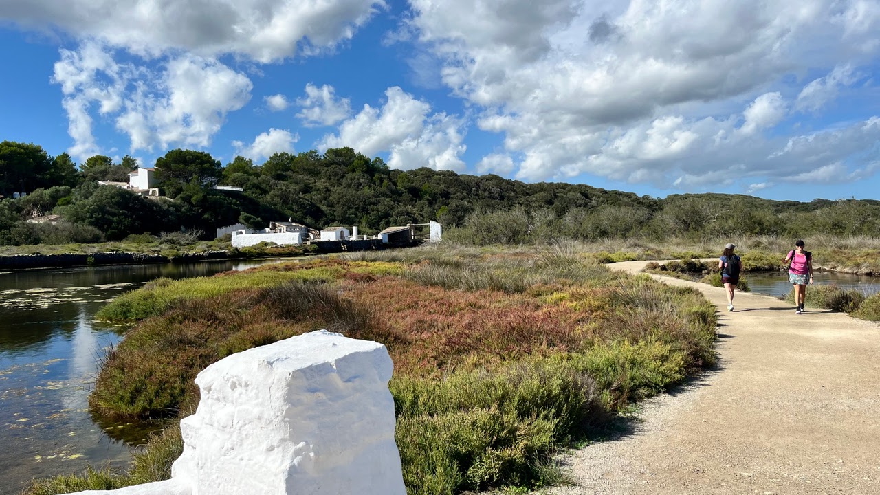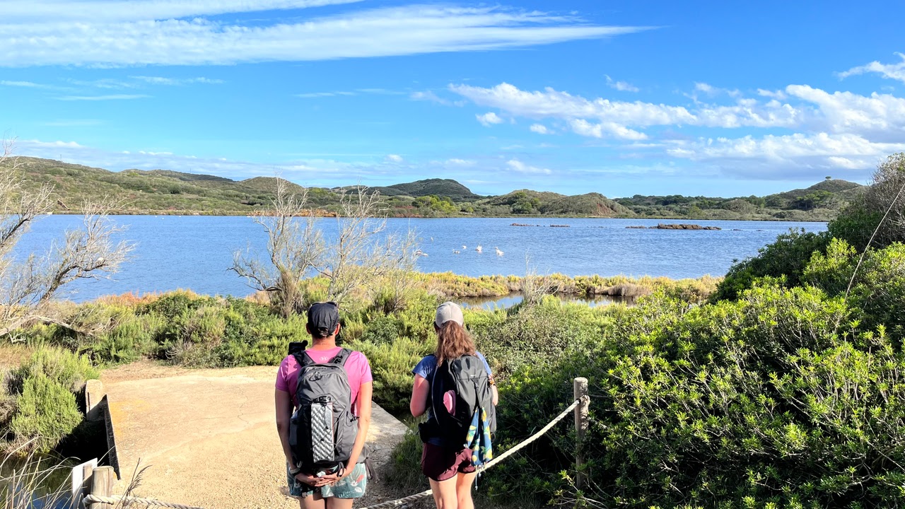 Nach der Bucht konnten wir die ersten Höhlen im Berg oberhalb von uns entdecken. Kurz darauf folgte der Trail wieder weg von der Küste und wir betraten grünes Farmland. Sogar Kühe begegnen uns auf dem Weg. Weiter ging es durch Salinen (Salzbecken), welche Abends durch die Flut mit Meerwasser voll liefen. Da es schon spät war, kam auch schon die Flut und wir mussten unseren Weg durch und um das Wasser suchen. Einige Flamingos leben in diesen Wasserbereich und wir blieben kurz stehen, um diese zu betrachten. Schließlich erreichten wir die kleine Feriensiedlung Port d’Addaia. Wir waren so durstig von dem langen heißen Wandertag und fanden zum Glück einen kleinen Supermarkt in El Castillo. Hier testeten wir auch gleich das „Wassereis“ La Menorquina, Gin mit Limonade. Sehr lecker… Aufgefüllt und zufrieden wanderten wir Richtung Endziel für die Nacht und passierten dabei ein Villenviertel nach dem nächsten. Ziemlich am Ende änderten wir den Weg ab und nahmen einen direkten Abzweig zu unserem Tagesziel Arenal d’en Castell. Am Hotel angekommen, stellte sich heraus, das Francesca im selbigen Nächtigte, obwohl sie in einem anderen gebucht hatte. Über den Tag hatten wir mehrere solcher Zufälle, das fanden wir dann fast ein bisschen spooky und wir mussten alle darüber lachen. Auf jeden Fall hatten wir einen wundervollen Wandertag und gute Gespräche mit ihr.